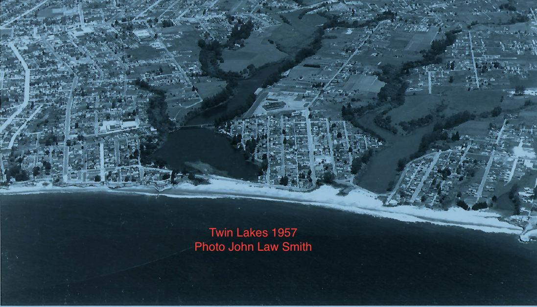 Feature photo courtesy of John Law Smith: Santa Cruz Eastside and west Live Oak/Twin Lakes, 1957, before Woods Lagoon became the Santa Cruz Harbor, and before Highway 1 was built. Schwan Lake, on the right, is part of Twin Lakes State Beach. The planned Broadway-Brommer Road would have crossed Woods Lagoon in roughly the middle of the picture; now, one of the Arana Gulch Park trails traverses the road right-of-way.