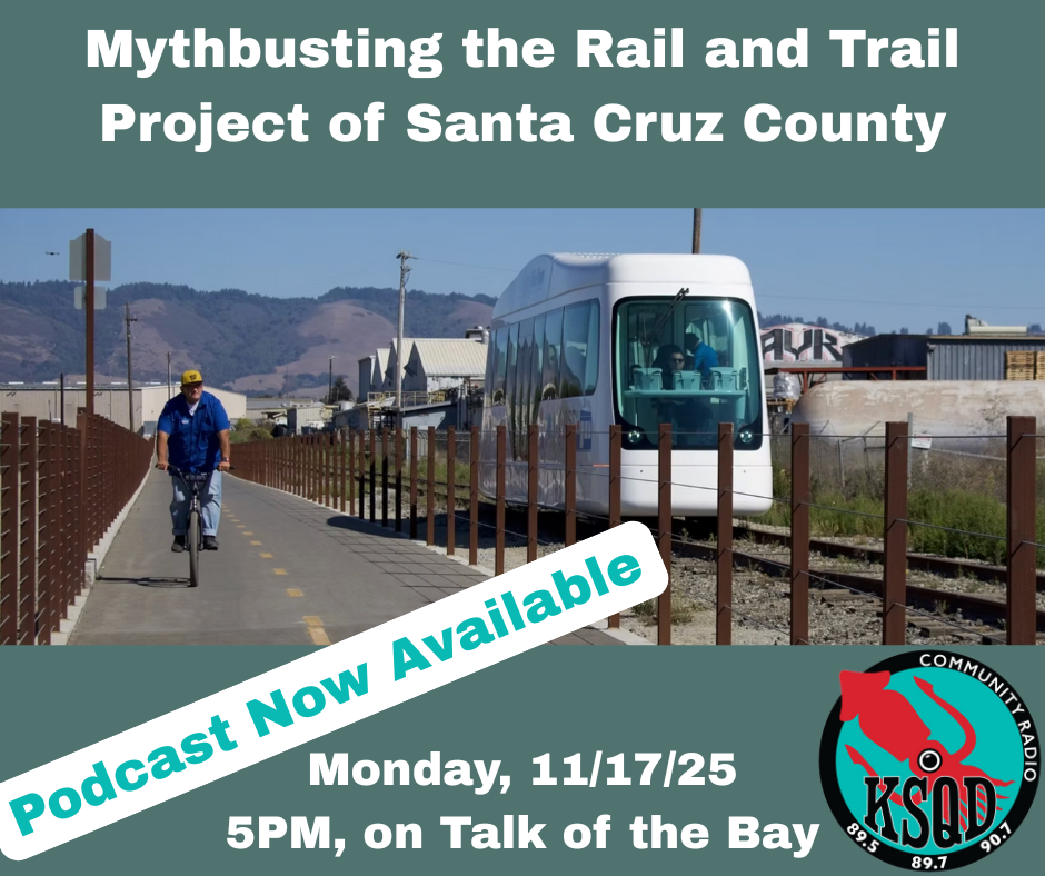 Because this show was recorded live on November 17, we’ve added an update at the top of the show, from Barry Scott, to reflect the new proposal from Fred Keeley and Manu Koenig to “Build those stretches of trail on top of the railroad tracks” as the Lookout Santa Cruz November 25th article describes it. This proposal will be part of the agenda for this Thursday’s RTC meeting which the public is welcome to join either in person at the Watsonville City Council Chambers or on Zoom from 9AM to 12PM. We encourage you to stay in touch with the commissioners and drop them a line to share your thoughts at: info@sccrtc.org. This is a link to a letter from Mayor Keeley to the Santa Cruz County Regional Transportation Commission 12/01/25: https://www.sccrtc.org/wp-content/uploads/2025/12/Handout-item-26-Partner-Letter.pdf.